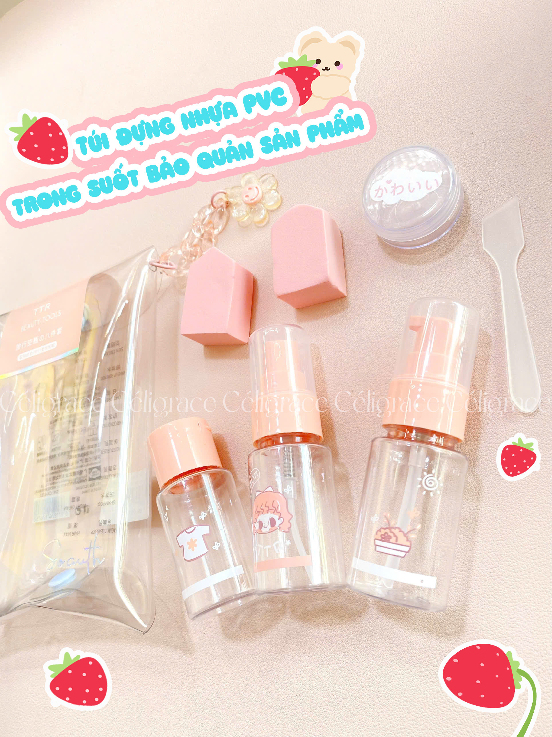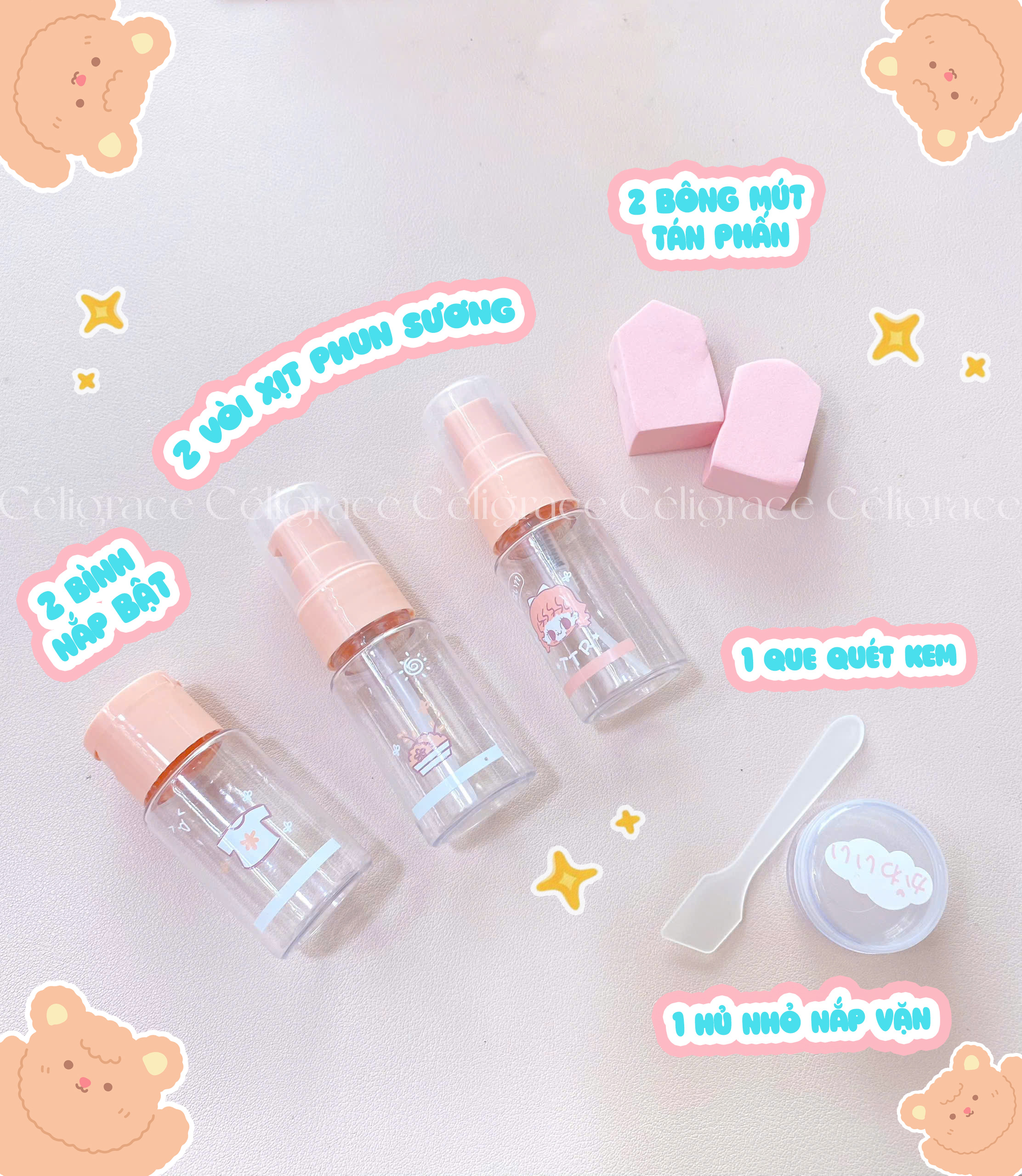 🍀 Bộ chiết mỹ phẩm du lịch: Giúp bạn đem theo những mỹ phẩm cần thiết như sữa rửa mặt, kem dưỡng