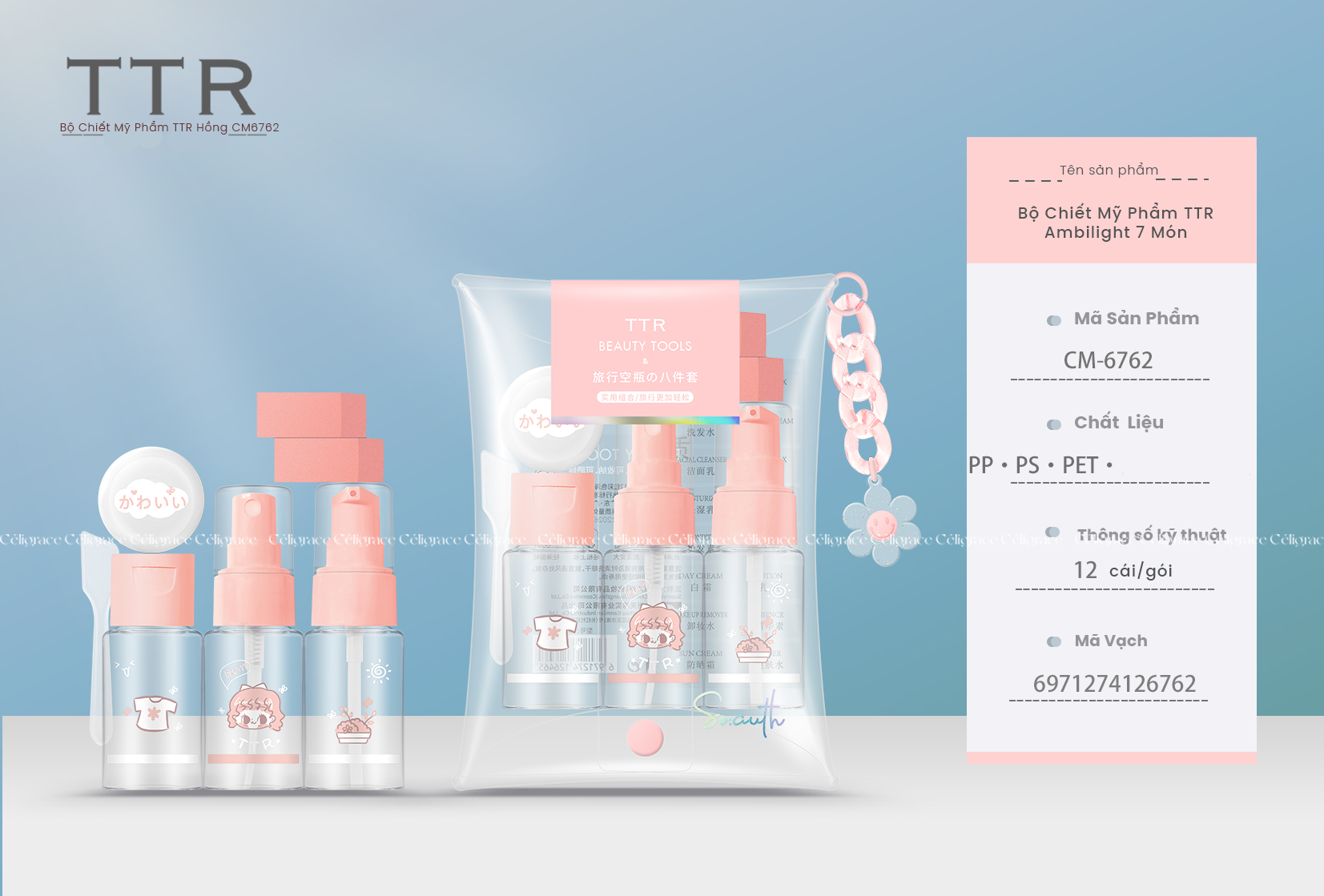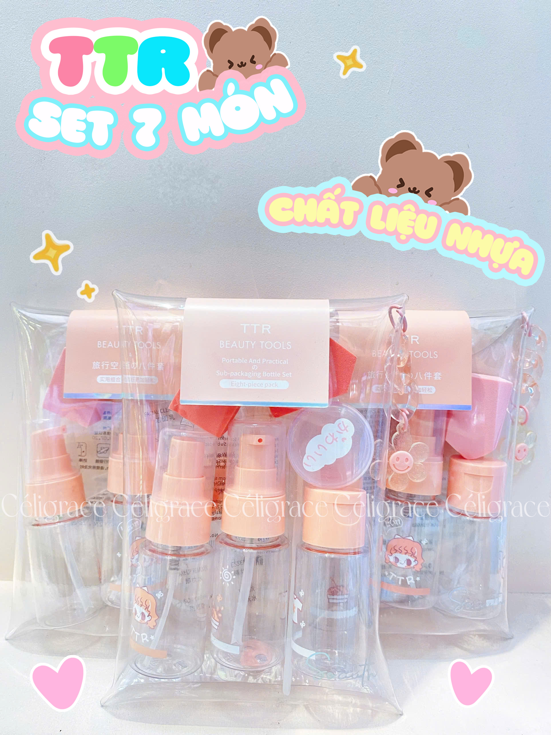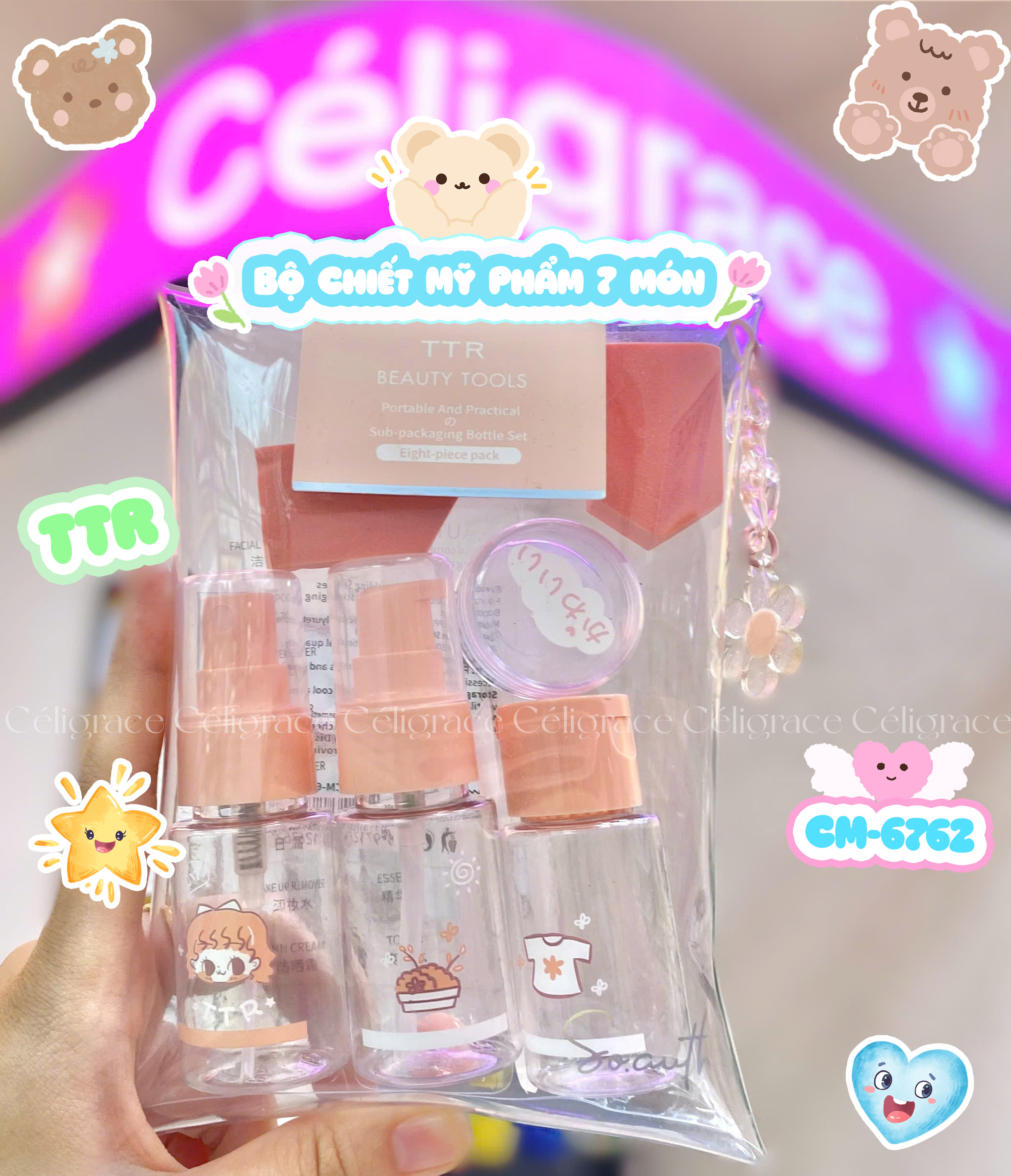 CM-6762 [SET 7 MÓN] - Bộ Chiết Mỹ Phẩm TTR Ambilight (Hồng-Túi Bấm) là bộ dụng cụ chiết mỹ phẩm đến từ thương hiệu TTR (CAMINE). Bộ chiết mỹ phẩm du lịch nhỏ gọn - tiện lợi giúp bạn đem theo những mỹ phẩm cần thiết, sản phẩm được làm rất chắc chắn và chống va đập tốt nên bạn có thể hoàn toàn yên tâm. Sản phẩm mang lại nhiều tiện ích mà bạn gái nào cũng sẽ thích thú khi nhận những món đồ xinh xắn này.