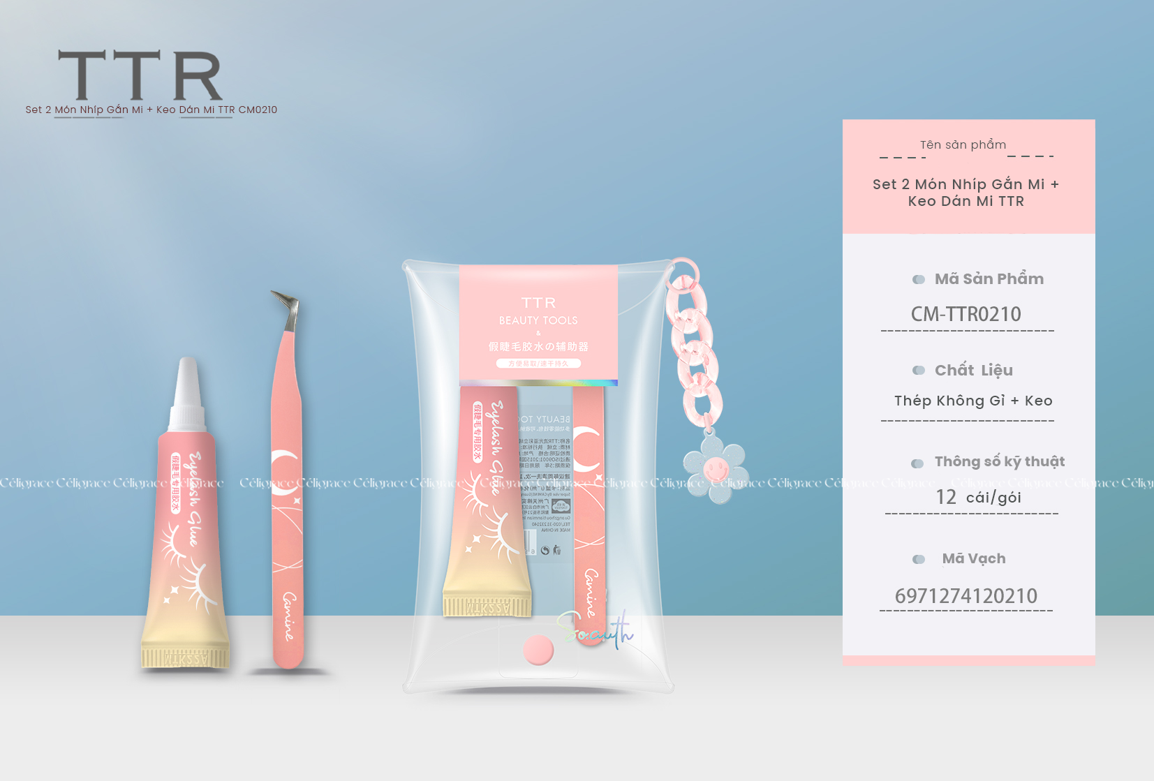 CM-TTR0210 - Set 2 Món Nhíp Gắn Mi + Keo Dán Mi là bộ đôi nhíp gắp mi giả và keo dán mi đến từ thương hiệu TTR (CAMINE). Nhíp với chất liệu thép không gỉ, thiết kế nhỏ gọn và chắc chắn, giúp hỗ trợ quá trình gắn mi giả nhanh hơn và chính xác vị trí muốn gắn mi hơn. Bên cạnh đó, keo dán mi có độ bền đẹp và bám dính lâu. Sử dụng keo dán mi giúp lông mi giả và lông mi thật kết hợp với nhau tạo thành làn mi dài, cong vuốt một cách tự nhiên.