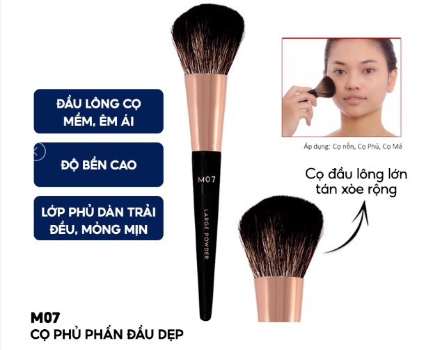 - Cọ đầu lông lớn tán xòe rộng, đa chức năng. Giúp tán phấn mỏng, vừa phải, bám đều trên gương mặt giúp lớp nền hoàn thiện một cách tự nhiên nhất.