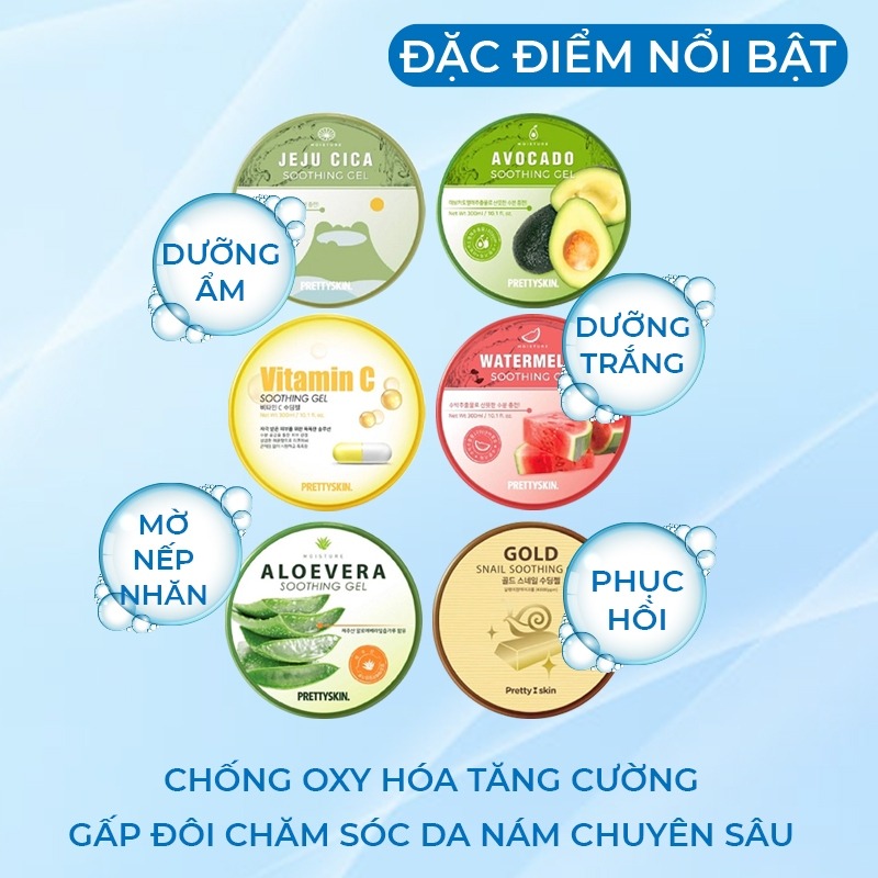 🍀 6 gel dưỡng đa năng Prettyskin đều chiết xuất từ thiên nhiên, bên cạnh ưu điểm mạnh là khả năng cấp ẩm sâu, làm dịu da nhanh chóng, mỗi loại gel còn có những ưu thế riêng: