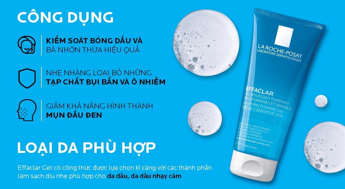 Sữa Rửa Mặt Dạng Gel Cho Da Dầu Mụn La Roche-Posay Effaclar Purifying Foaming Gel For Oily Sensitive Skin giúp nhẹ nhàng làm sạch bụi bẩn và bã nhờn dư thừa - nguyên nhân chính gây nên mụn. Không làm khô da nhờ các thành phần làm sạch nhẹ nhàng được lựa chọn kỹ càng. Mang lại cảm giác tươi mát và dễ chịu cho làn da