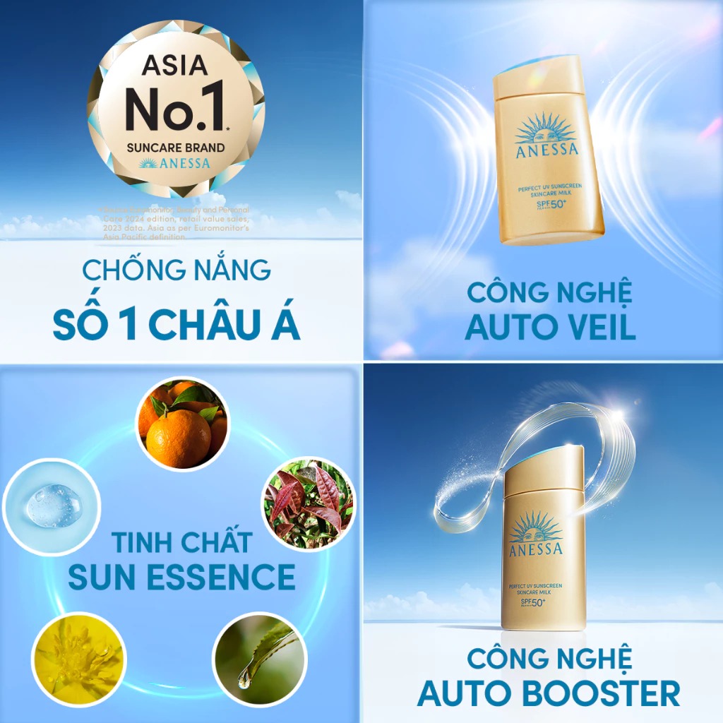 Kem Chống Nắng Anessa Dạng Sữa Chống Trôi - Kiềm Dầu Perfect UV Sunscreen Skincare Milk SPF50+/PA++++ là kem chống nắng thuộc thương hiệu Anessa với dạng sữa thẩm thấu nhanh và phủ lên lớp màng bảo vệ với chỉ số chống nắng cực cao cùng công nghệ Aqua Booster Ex bổ sung thêm tính năng chống ma sát giúp lớp chống nắng vẫn bền bỉ ngay cả khi làn da bị cọ xát, tiếp xúc nhiều. Bên cạnh đó bổ sung đến 50% chiết xuất dưỡng da tự nhiên cấp ẩm sâu và bảo vệ da trước các tác hại của tia UV hay môi trường.