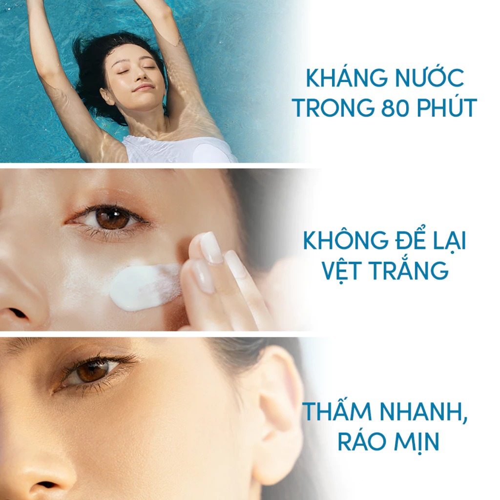 🍀 Chống nước và mồ hôi mạnh mẽ: Chống thấm nước và mồ hôi mạnh mẽ hơn nhờ áp dụng công nghệ độc quyền Aqua Boost™. Aqua Boost™ sử dụng một loại bột đặc biệt có khả năng liên kết với các Ion khoáng trong nước và mồ hôi để dàn trải đồng đều các hoạt chất chống nắng và tạo thành một màng bảo vệ vững chắc, ngăn chặn sự rửa trôi của nước và mồ hôi.