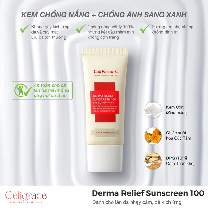 Kem Chống Nắng Dịu Nhẹ, An Toàn Cho Mọi Loại Da Cell Fusion C Derma Relief Sunscreen 100 SPF50+/PA++++ dưỡng ẩm dịu nhẹ cho làn da mỏng manh và nhạy cảm, kem chống nắng vật lý giúp ngăn chặn tia UVA/UVB một cách nhẹ nhàng và an toàn cho cả gia đình (kể cả trẻ em)