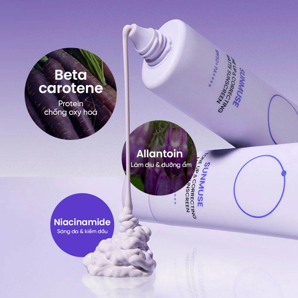 - Kiềm dầu, sáng da: Các thành phần nổi bật trong sản phẩm như: Allantion làm dịu và dưỡng da, Niacinamide kiềm dầu và hỗ trợ sáng da, chiết xuất cà rốt tím giàu chất dinh dưỡng và chất oxy hóa.