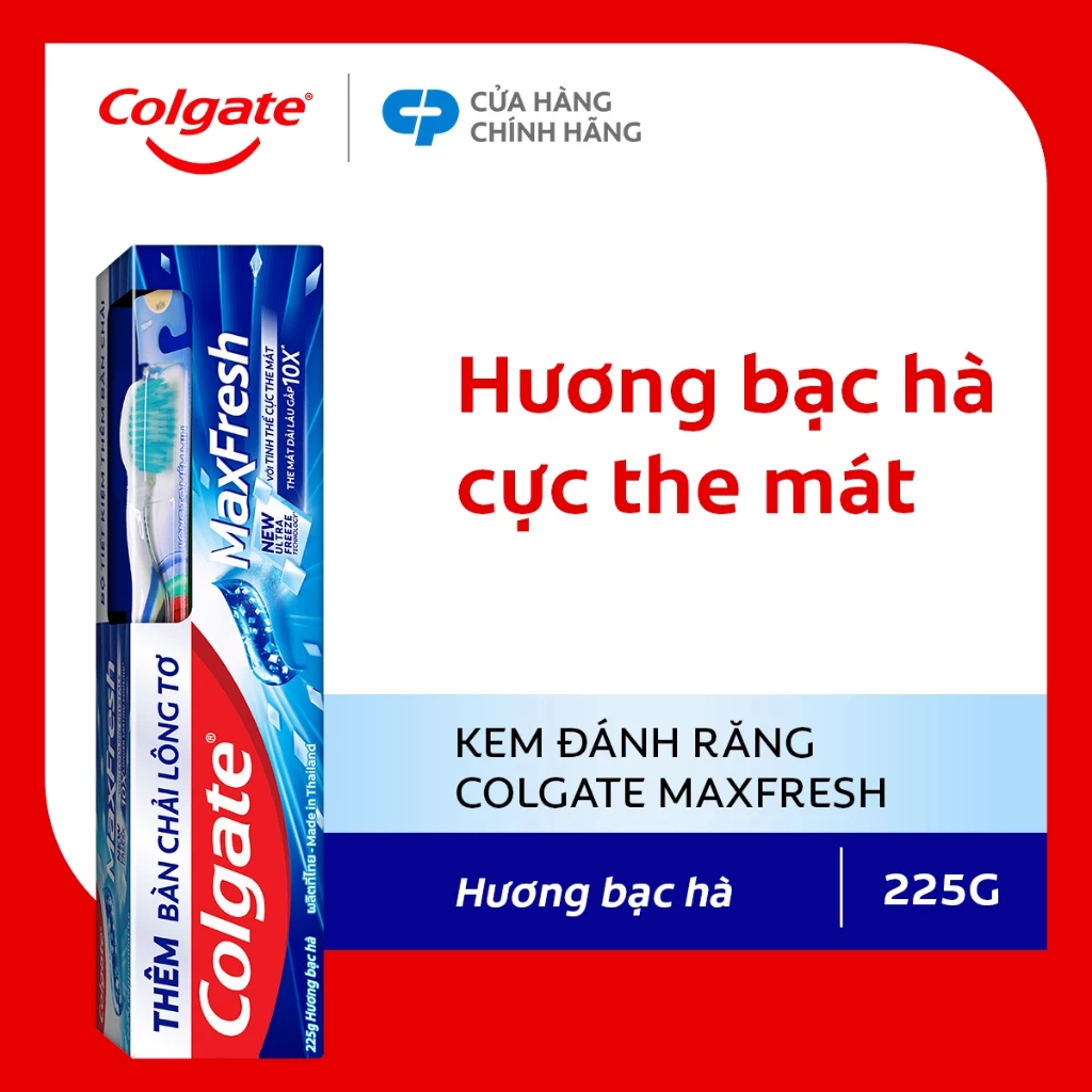 - Kem đánh răng Colgate Maxfresh với các tinh thể the mát tự hòa tan, trộn lẫn trong kem sẽ mang đến cảm giác sảng khoái khi chải răng và hơi thở thơm mát suốt nhiều giờ.