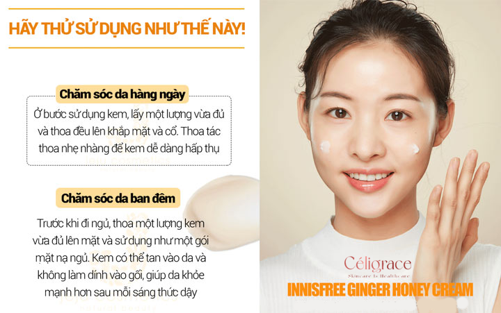Sử dụng ở bước cuối cùng trong quá trình chăm sóc da, lấy một lượng kem dưỡng da Innisfree Ginger Honey Cream vừa đủ ra tay và thoa lên toàn bộ khuôn mặt và cổ của bạn, kết hợp massage nhẹ nhàng để dưỡng chất dễ thấm nhanh vào da. Dùng 1-2 lần/ngày.