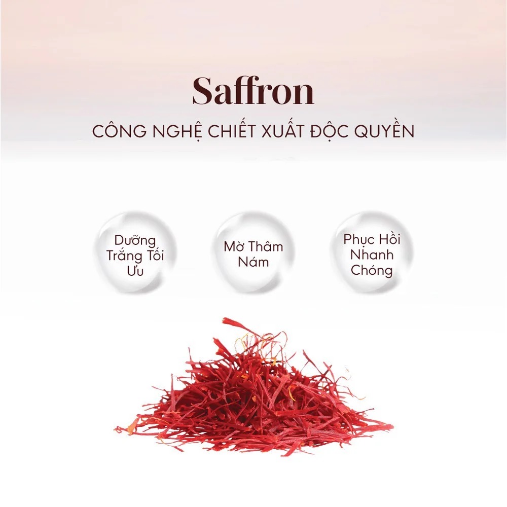 🍀Chứa nhụy hoa nghệ tây có chứa Carotenoid, Retinol cùng các hoạt chất chống oxy hóa, giúp ức chế hoạt động của Enzyme Tyrosinase – thủ phạm tạo nên Melanin khiến da sạm màu. Đặc biệt được quan tâm nhất là thành phần Crocin có tác dụng chống lão hóa tuyệt vời, ngăn ngừa tác hại của tia UV, làm trắng, giảm nám, hạn chế mụn, phục hồi thương tổn trên da do mụn. Ngoài ra nhụy hoa nghệ tây còn giàu Vitamin (đặc biệt B1 và B2), các Amino Acid, Khoáng Chất...mang đến nhiều lợi ích cho da