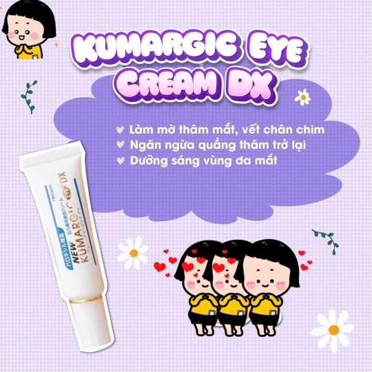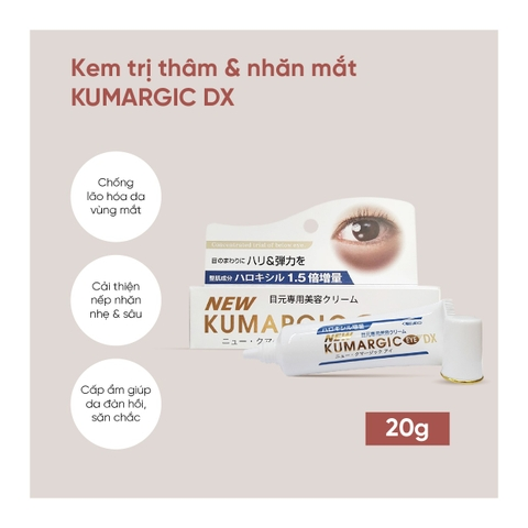 Kem Dưỡng Mắt Kumargic Giảm Quầng Thâm & Bọng Mắt (Mới) 20g là sản phẩm kem dưỡng mắt đến từ thương hiệu Kumargic của Nhật Bản, hỗ trợ tuần hoàn máu, xua tan quầng thâm, ngăn ngừa và cải thiện nếp nhăn, cho bạn đôi mắt long lanh và sáng khỏe, đầy thu hút. Kem dưỡng mắt được chiết xuất hoàn toàn từ thiên nhiên, dễ dàng thấm sâu vào các tế bào da và kết hợp với các tinh thể thủy tinh 7 giúp tạo độ phản quang, che lấp khuyết điểm và quầng thâm mắt khi trang điểm. Kumargic Eye Cream làm thư giãn các tĩnh mạch chính, giúp lưu thông tốt các mạch máu cho mắt không thâm quầng, bảo vệ các tế bào da và biểu bì.