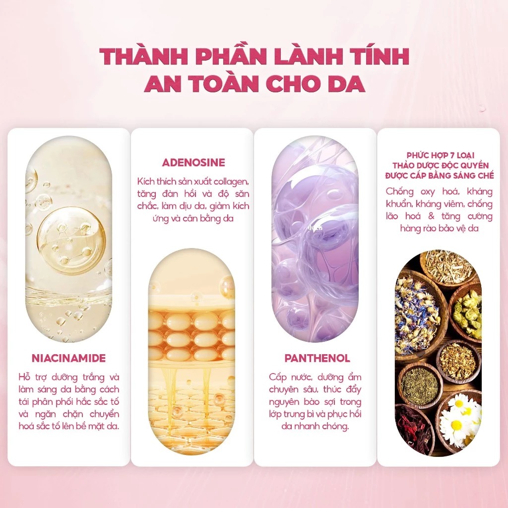 🍀 Tế bào gốc sống: Kích thích sự sản sinh tế bào mới, hỗ trợ phục hồi da và loại bỏ nhẹ nhàng lớp tế bào chết, tăng cường đàn hồi cho da săn chắc, láng mịn.