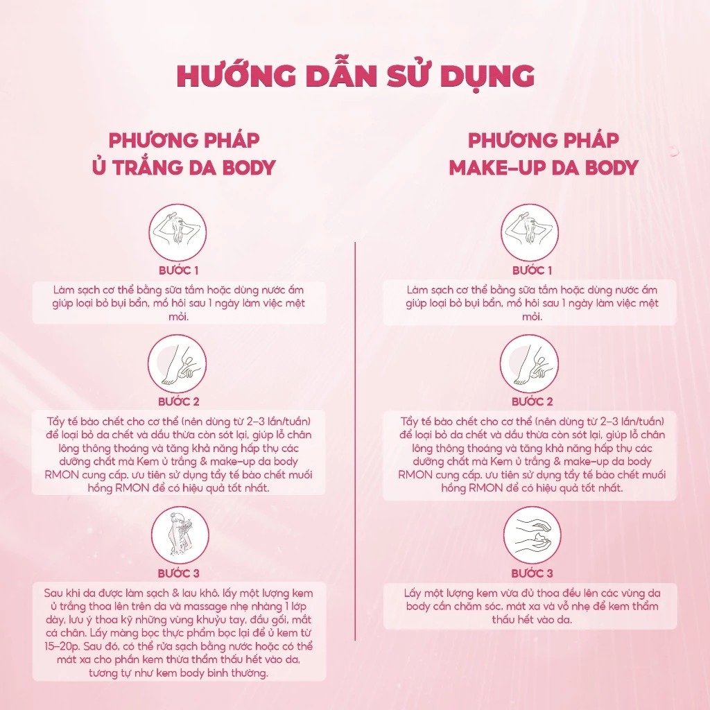 - Bước 2: Lấy 1 lượng kem dưỡng Rmon vừa đủ thoa đều lên toàn thân và massage nhẹ nhàng khoảng 1 – 2 phút để các dưỡng chất được thẩm thấu sâu hơn, chú ý những nơi như cổ, lưng, tay chân, khuỷu tay, đầu gối,…