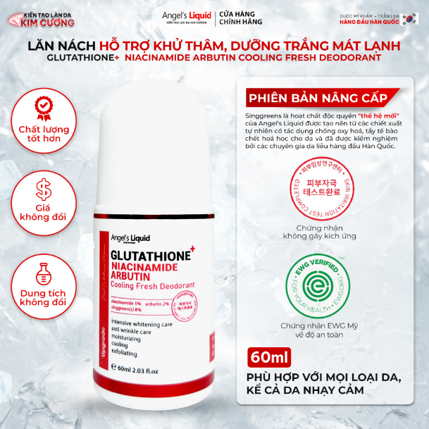 Lăn Khử Mùi Angel's Liquid Mờ Thâm, Dưỡng Trắng Da Glutathione+ Niacinamide Arbutin Cooling Fresh Deodorant 60ml là lăn khử mùi đến từ thương hiệu Angel's Liquid. Sản phẩm giúp khử mùi, làm mát vùng da dưới cánh tay, hạn chế mồ hôi tạo mang đến cho bạn cảm giác khô thoáng thoải mái và dễ chịu với công thức độc quyền 50.000ppm Niacinamide + 20.000ppm Arbutin + Glutathione cải thiện các vấn đề thâm sạm nhanh hơn gấp 5 lần với các tình trạng thâm thâm của các vùng da trên cơ thể như: vùng nách, khuỷu tay, đầu gối.