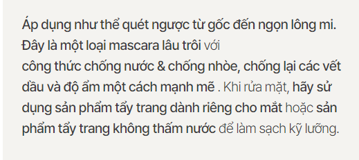 Nhẹ nhàng chải lông mi từ gốc đến ngọn. Sử dụng sản phẩm tẩy trang chuyên dụng cho mắt khi tẩy trang.