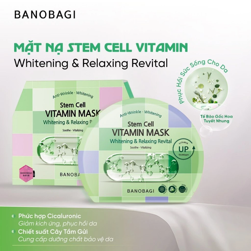 🍀[New] Banobagi Stem Cell Vitamin Mask Whitening & Relaxing Revital: chứa tế bào gốc từ hoa tuyết nhung có tác dụng bảo vệ da, hạn chế kích ứng da và giúp làm dịu da. Chứa dẫn xuất Cicaluronic là phức hợp từ rau má và Acid Hyaluronic (HA) giúp da khỏe mạnh, cấp nước, kháng viêm cho da. Chứa chiết xuất cây tầm gửi cung cấp dưỡng chất và bảo vệ da. Giúp giảm các vết mẫn đỏ, làm dịu da, bảo vệ da.