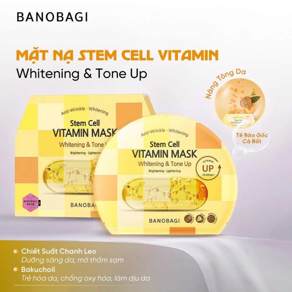 🍀Banobagi Stem Cell Vitamin Whitening & Tone Up: chứa Phức hợp vitamin làm sáng da và chiết xuất cà rốt đem đến lượng vitamin A tái tạo và phục hồi làn da trắng và khỏe, ức chế sự tổng hợp melanin ở lớp hạ bì của da để mang lại làn da tươi trẻ, sáng mịn.