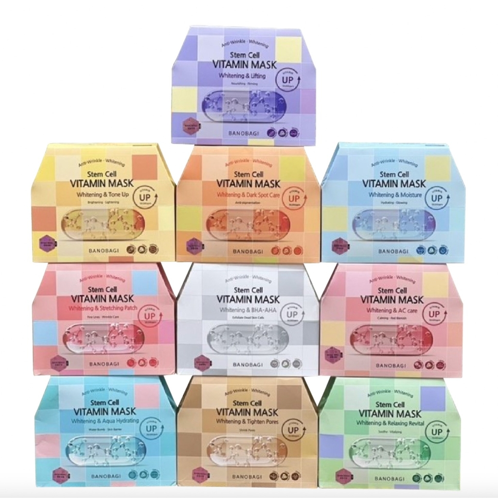 🍀[New] Banobagi Stem Cell Vitamin Mask Whitening & Aqua Hydrating: chứa Niacinamide có công dụng dưỡng sáng, chống oxy hoá, duy trì độ ẩm và ngăn ngừa lão hoá da. Chứa Panthenol tăng cường khả năng giữ nước trên da, hỗ trợ kiểm soát dầu thừa và khôi phục ổn định hàng rào bảo vệ da. Chứa 7 loại Hyaluronic Acid cung cấp nước, độ ẩm dồi dào đem lại làn da mềm mại, căng mọng nước. Chứa các thành phần thiên nhiên: sơn trà, dâu tằm, địa liền, dầu hạt mắc ca, dầu dừa, táo, đậu xanh, sắn dây,… dưỡng da ẩm mịn, sáng khoẻ.