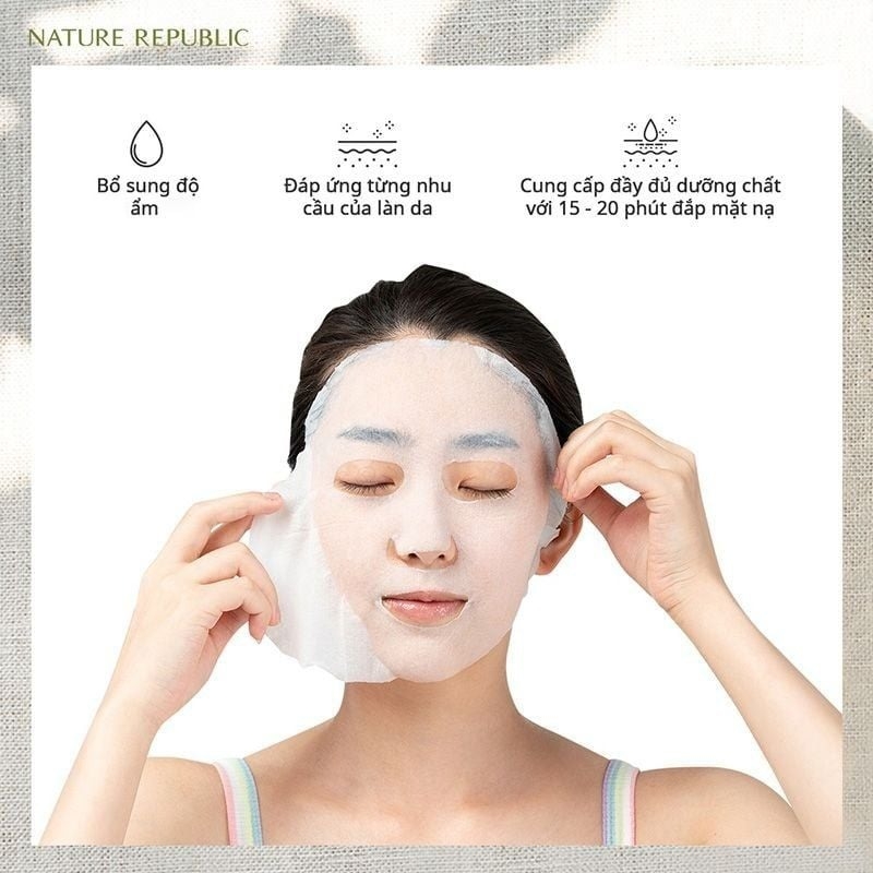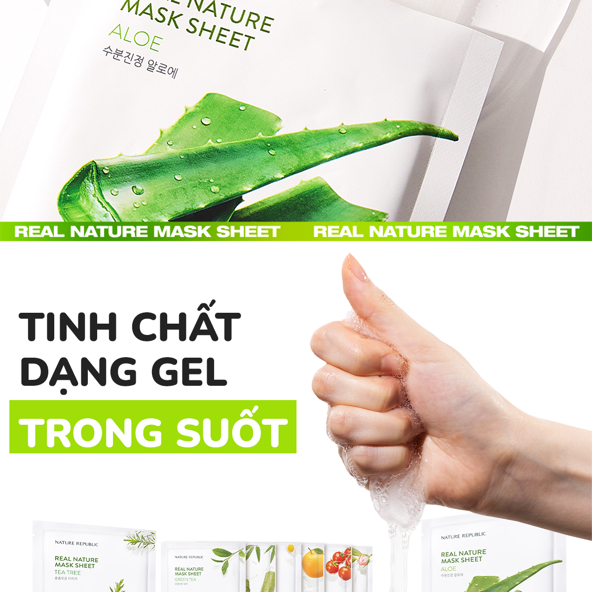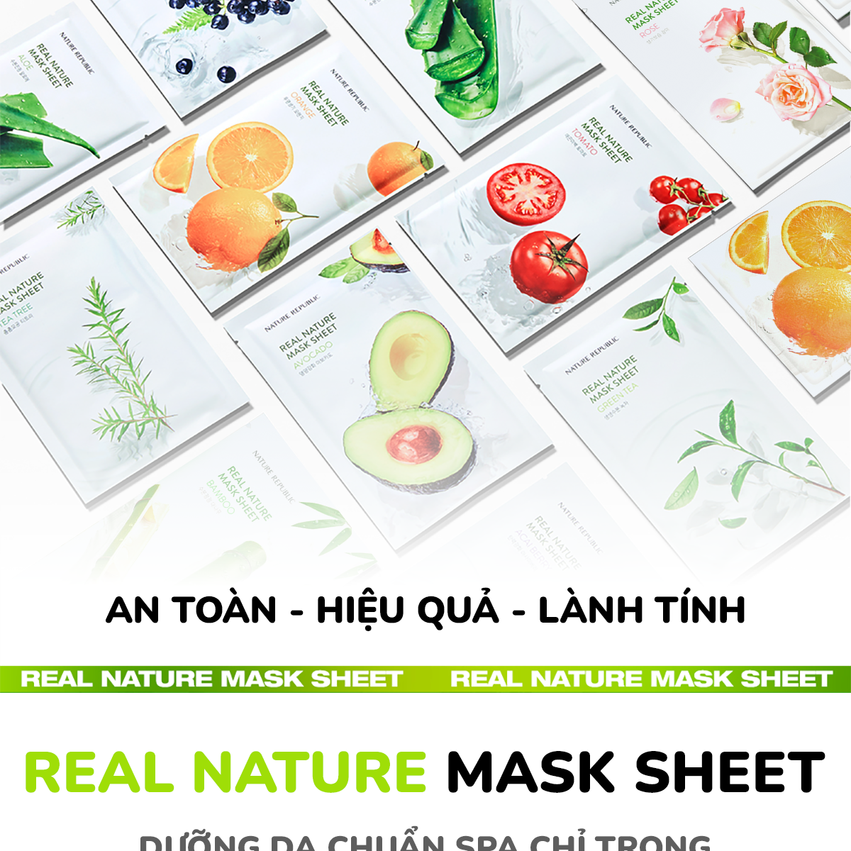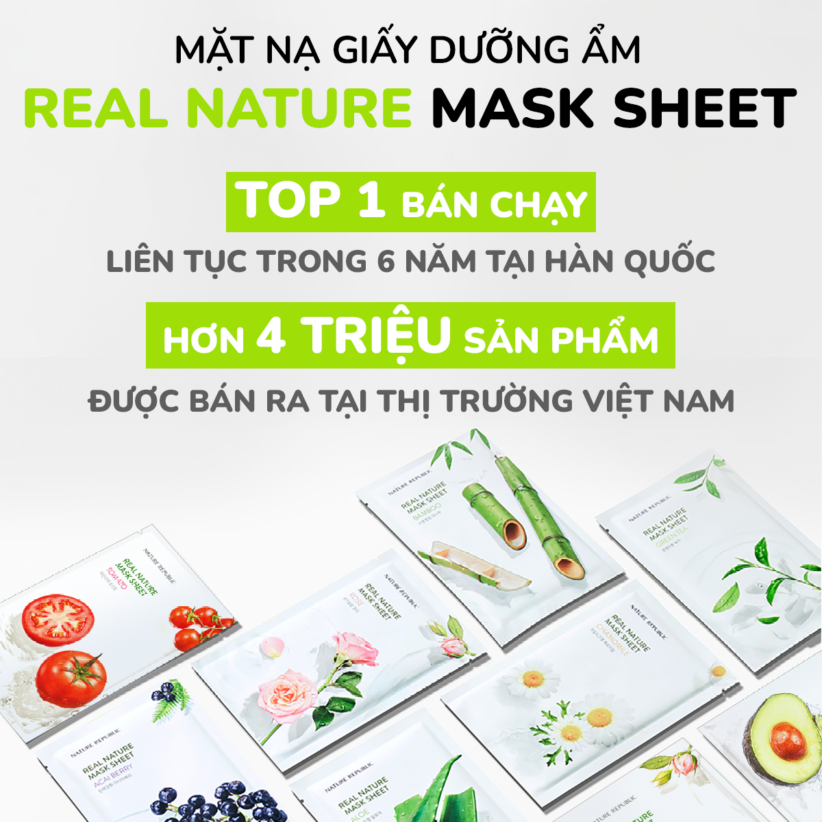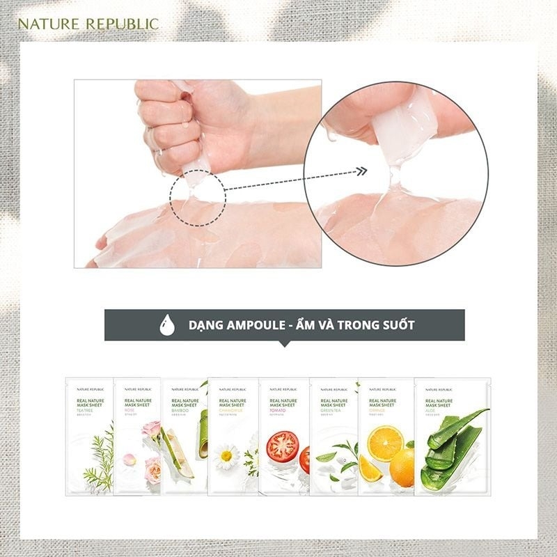 Mặt Nạ Dưỡng Ẩm Nature Republic Chiết Xuất Từ Thiên Nhiên Real Nature Mask Sheet 23ml là dòng mặt nạ thuộc thương hiệu Nature Republic được làm từ chất liệu Cellulose tự nhiên tăng tối đa khả năng bám dính, cấu tạo 3 lớp liên tục cung cấp dưỡng chất cô đặc cho da cùng các thành phần thiên nhiên giàu dưỡng chất khác nhau giúp chăm sóc da mặt, cải thiện các vấn đề về da mang lại làn da mềm mịn, trắng sáng.