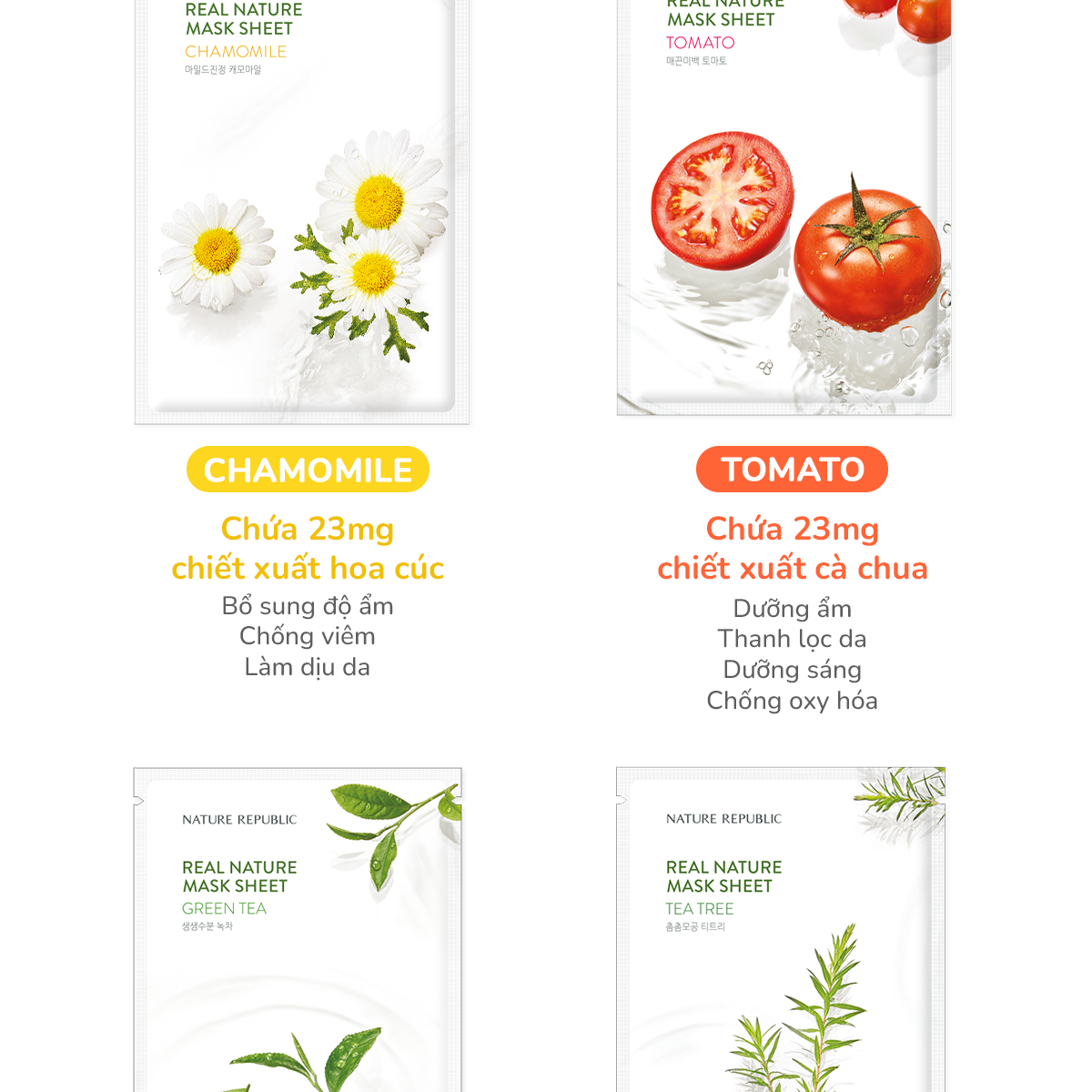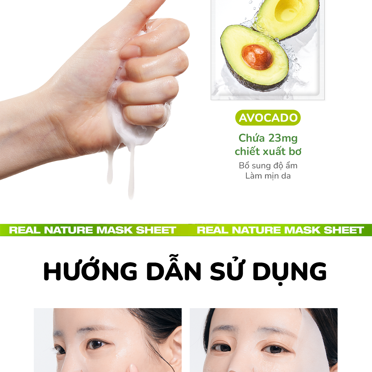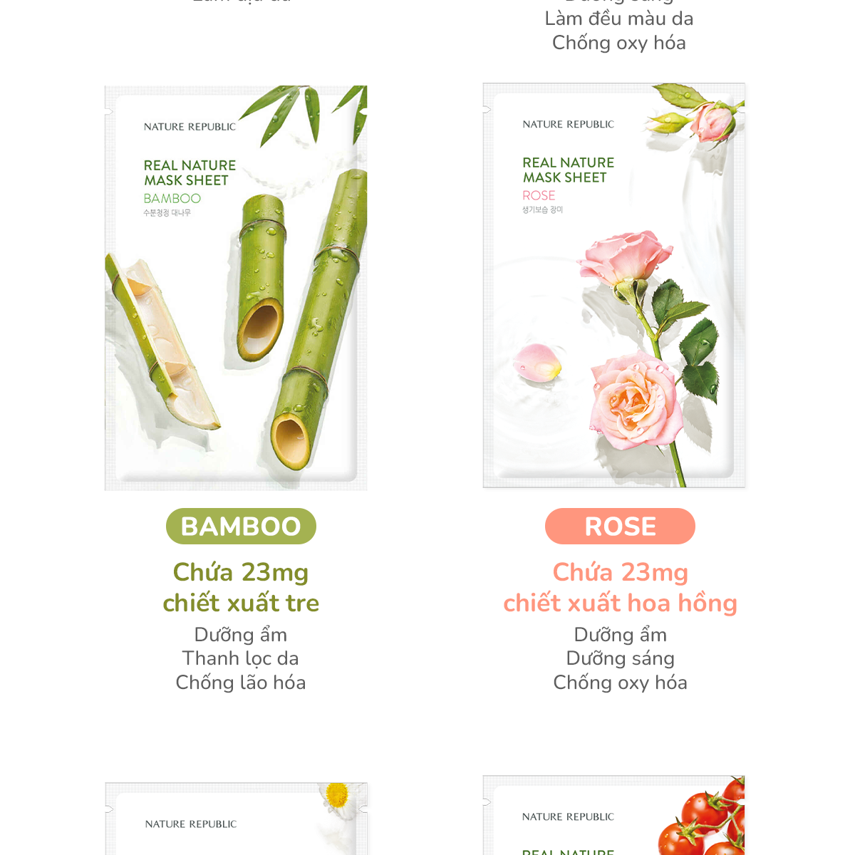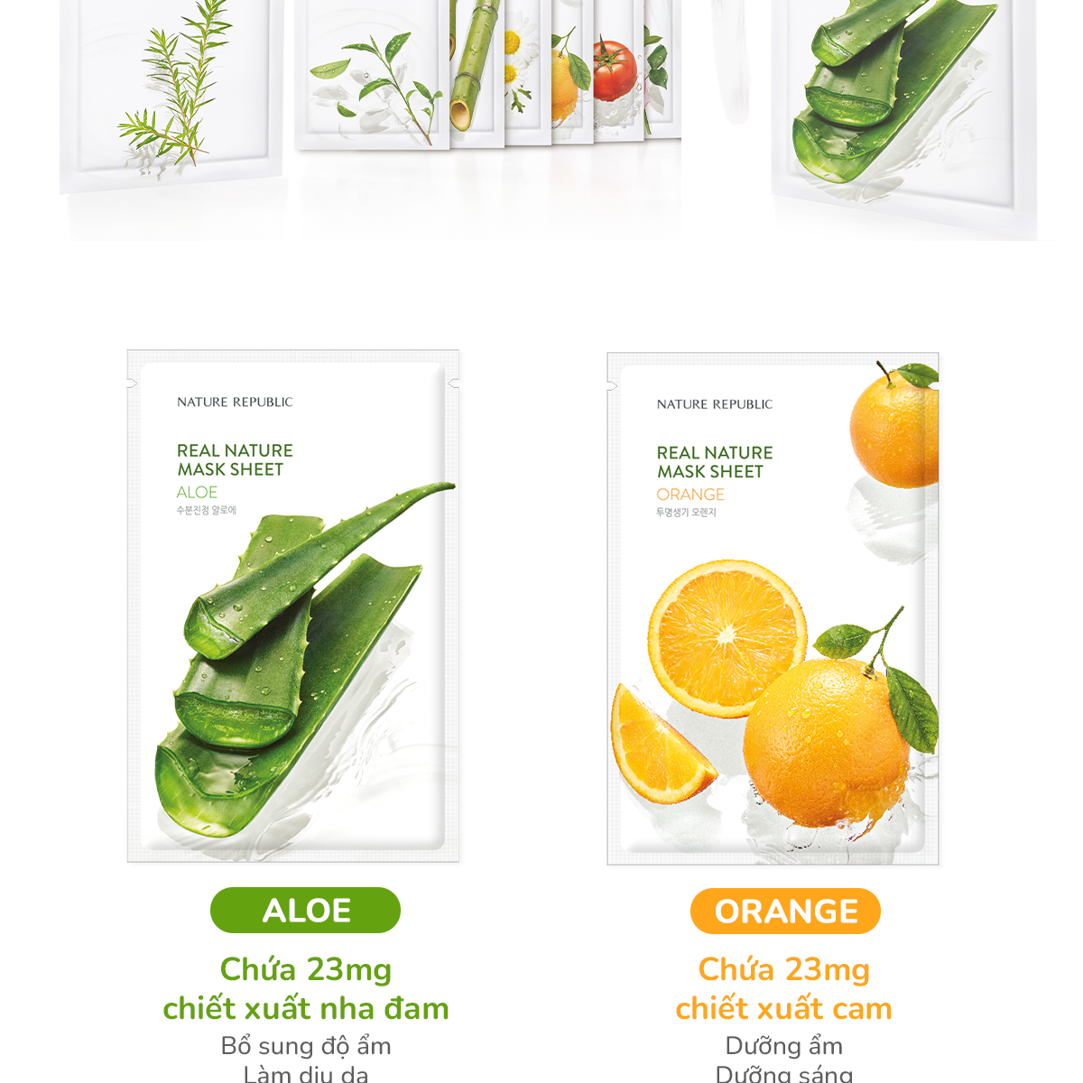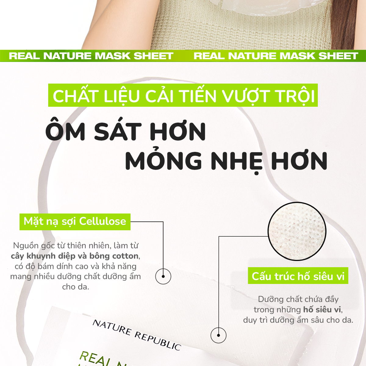 Mặt Nạ Dưỡng Ẩm Nature Republic Chiết Xuất Từ Thiên Nhiên Real Nature Mask Sheet 23ml là dòng mặt nạ thuộc thương hiệu Nature Republic được làm từ chất liệu Cellulose tự nhiên tăng tối đa khả năng bám dính, cấu tạo 3 lớp liên tục cung cấp dưỡng chất cô đặc cho da cùng các thành phần thiên nhiên giàu dưỡng chất khác nhau giúp chăm sóc da mặt, cải thiện các vấn đề về da mang lại làn da mềm mịn, trắng sáng.