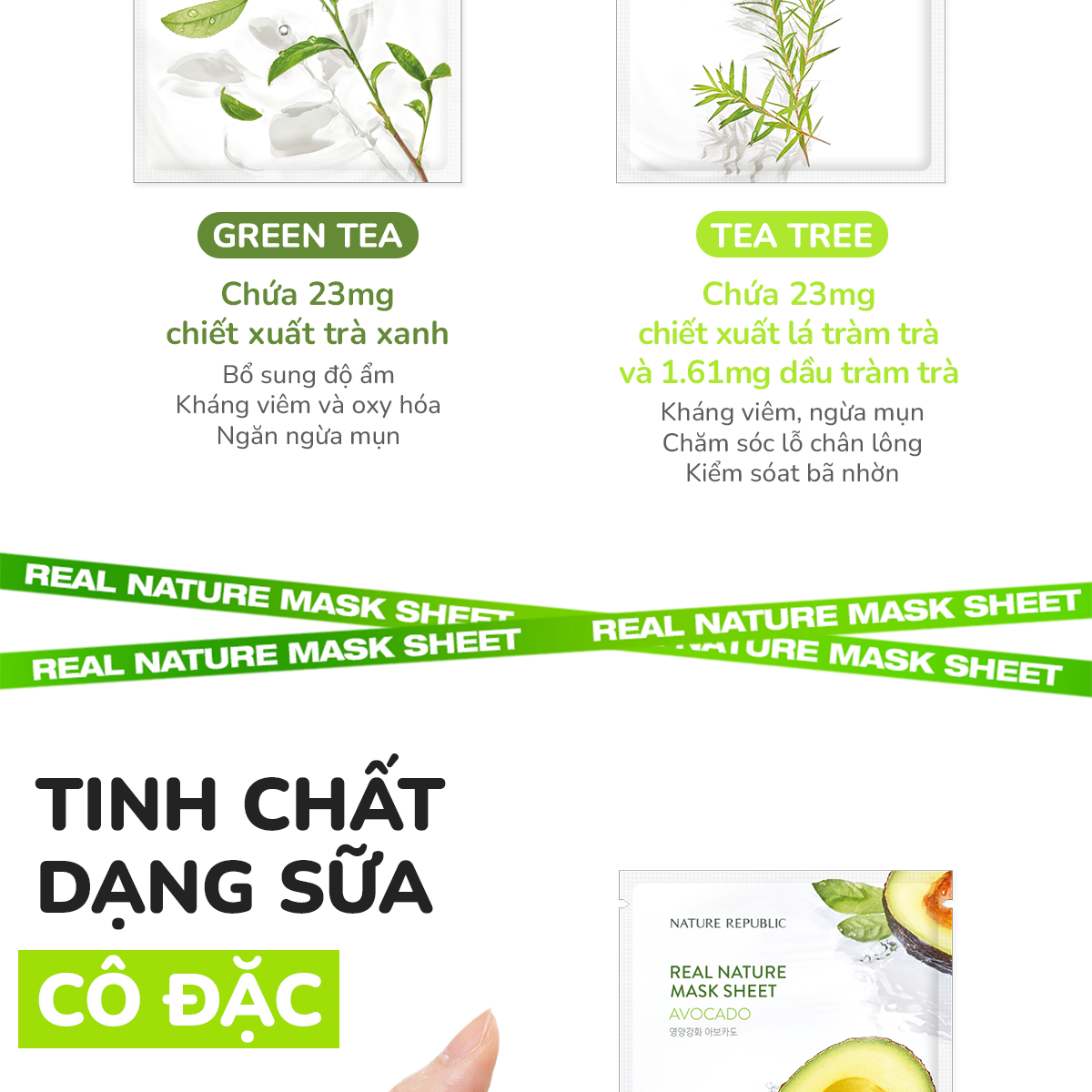- Chiết xuất Trà Xanh (Green Tea): Giúp làm dịu da, chống oxy hoá, cải thiện độ đàn hồi và săn chắc da: