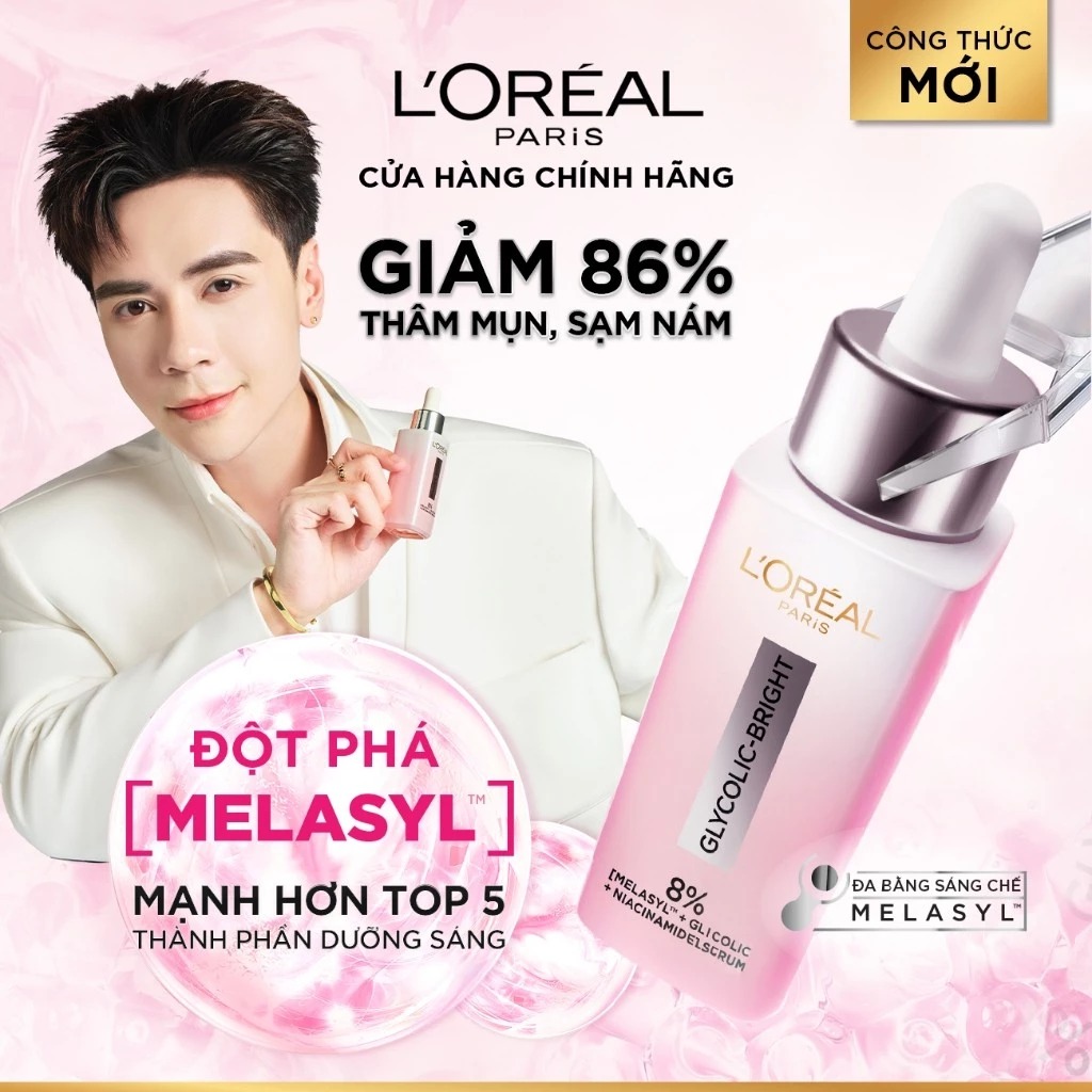 Serum L'oreal Tinh Chất Mờ Thâm Nám Glycolic-Bright Melasyl 8% [Melasyl+Glycolic+Niacinamide] MỚI với thành phần đột phá sáng da MelasylTM từ viện nghiên cứu L’oreal Paris – hiệu quả hơn 5 hoạt chất sáng da phổ biến, cùng phức hợp hoạt chất 8% [Melasyl+Glycolic+Niacinamide] giúp mang đến khả năng vượt trội GIẢM 86% THÂM MỤN & NÁM*.