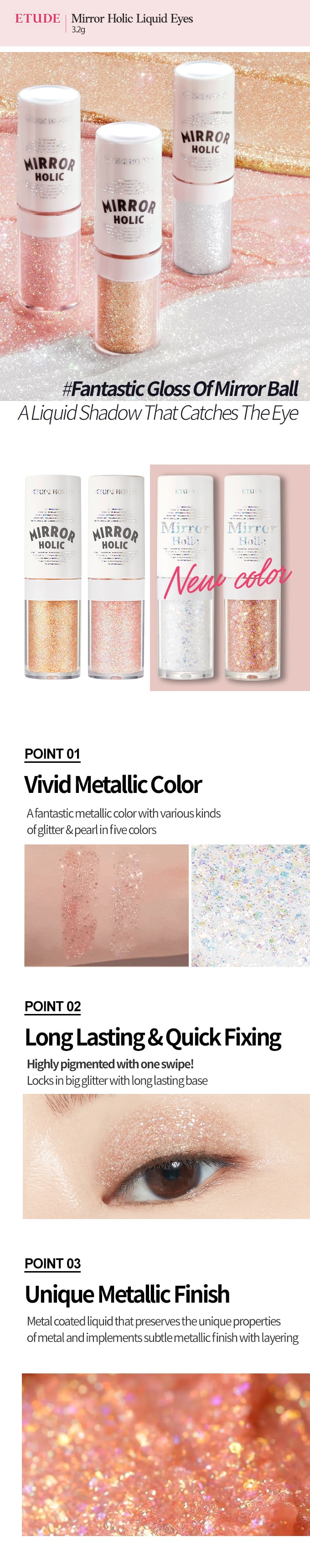 Nhũ mắt Etude House Mirror Holic Liquid Eyes 3.2g là dòng nhũ mắt dạng lỏng lấp lánh đầy sắc màu trang điểm cho đôi mắt rực rỡ, thu hút, ở mọi góc nhìn