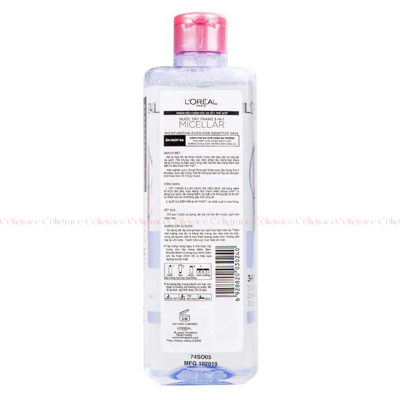 Nước Tẩy Trang L'OREAL Dưỡng Ẩm Cho Da Thường, Khô Micellar Water 3-in-1 Moisturizing Even For Sensitive Skin (Nắp Hồng)