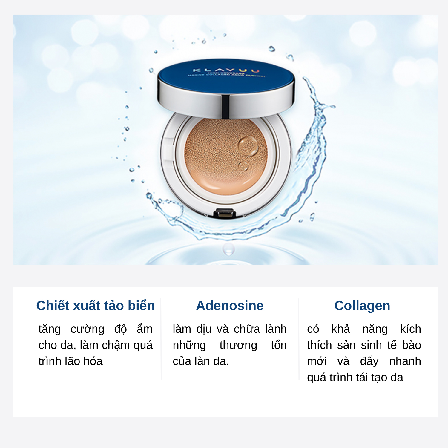 Phấn Nước Căng Bóng Cấp Ẩm Klavuu Blue Pearlsation với thành phần là các chất dưỡng ẩm, collagen và tinh chất ngọc trai giúp da được tái tạo liên tục và làm trắng tự nhiên. Chỉ cần một lượng sản phẩm vừa đủ giúp da được che phủ siêu tốt, mềm mịn và tươi trẻ hơn. Thêm vào đó là chỉ số SPF 50 giúp bảo vệ da khỏi tá hại của mặt trời.