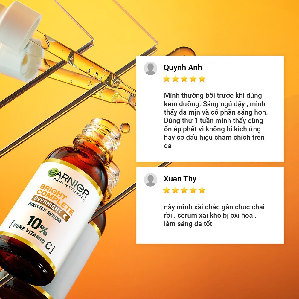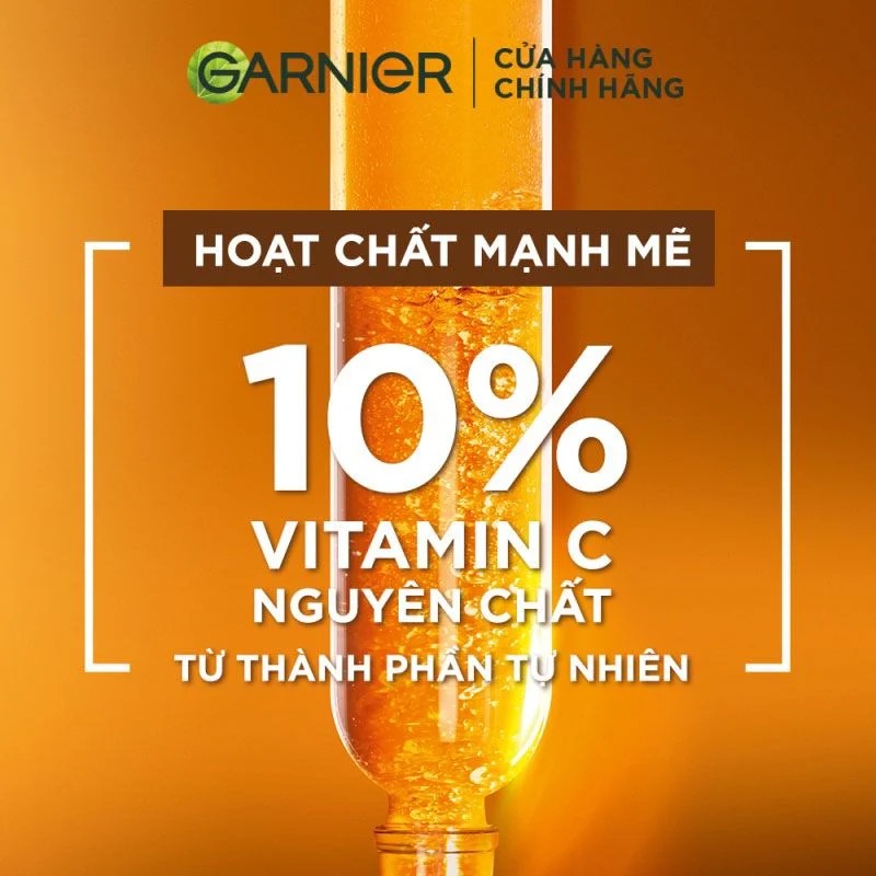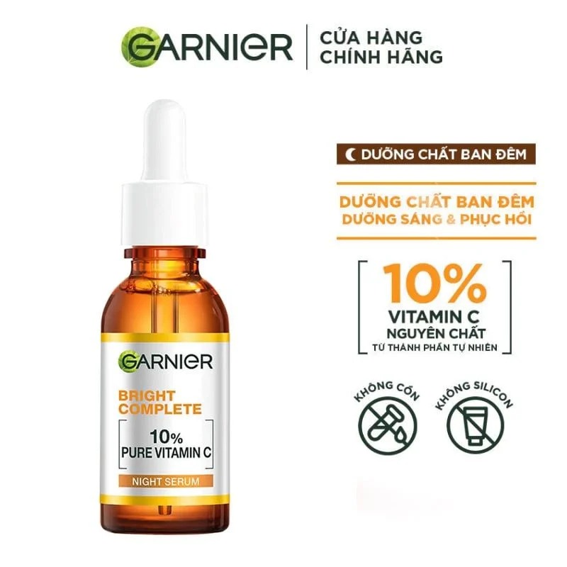 Serum Garnier Tinh Chất Dưỡng Sáng Da, Mờ Thâm Ban Đêm 10% Vitamin C - Bright Complete Overnight Serum là tinh chất dưỡng da thuộc thương hiệu Garnier chứa 10% Vitamin C nguyên chất từ thành phần thiên nhiên cùng Hyaluronic Acid giúp bổ sung độ ẩm, dưỡng da sáng khỏe, giảm và ngừa thâm hiệu quả mang lại làn da căng mướt, sáng mịn, đều màu.