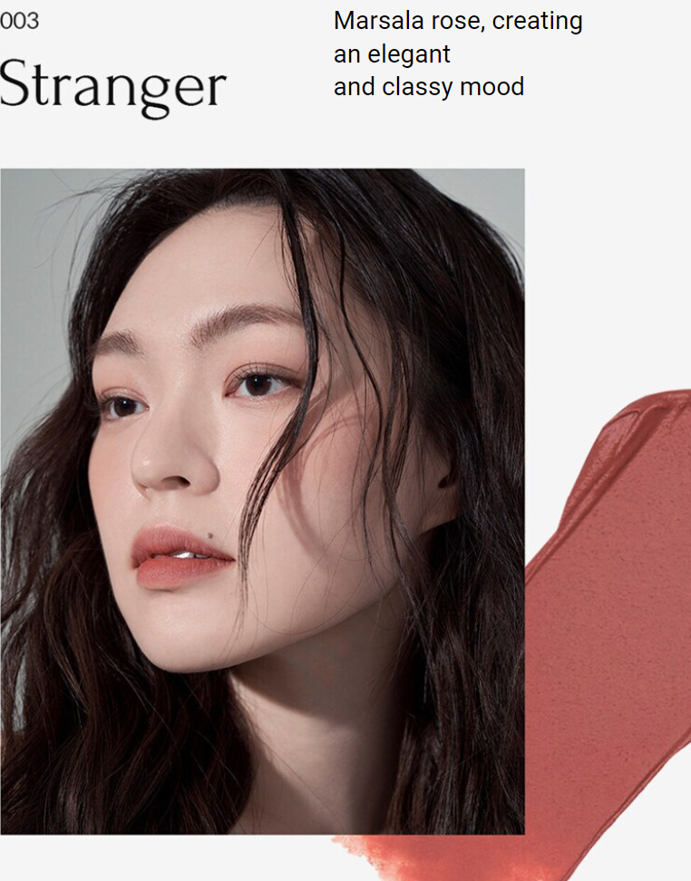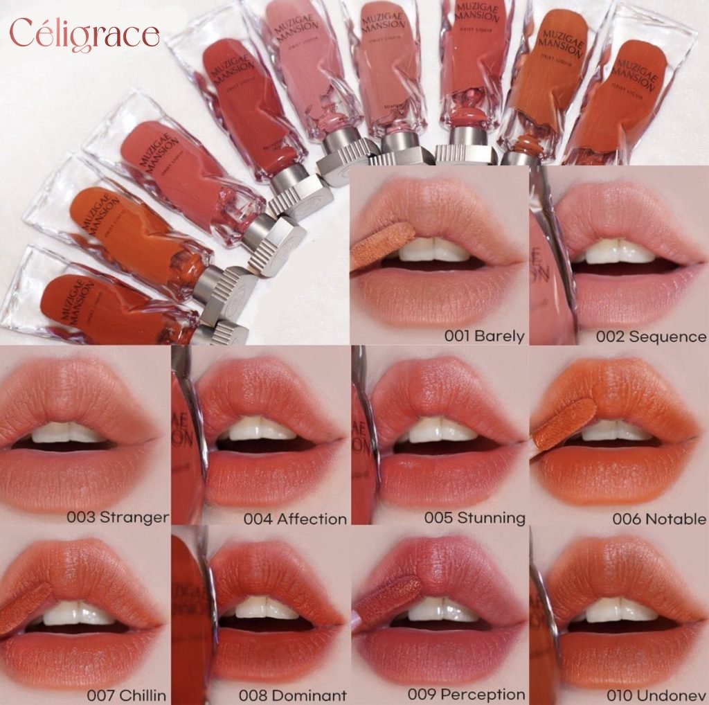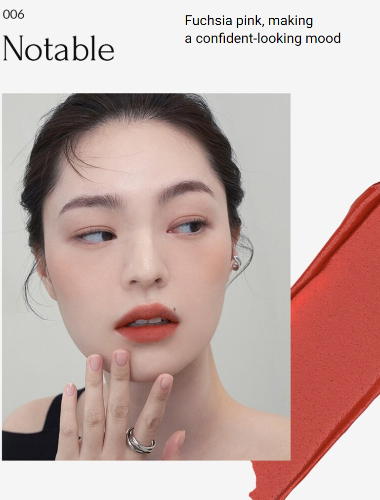 • 001 – Barely cam nude: rất hợp với các nàng thích nhìn “Tây” một chút, màu cam nude Muzigae sẽ đem lại hiệu ứng nhấn nhá tinh tế, quyến rũ, phong cách và cũng rất tự nhiên kiểu “no make up” của phương Tây.