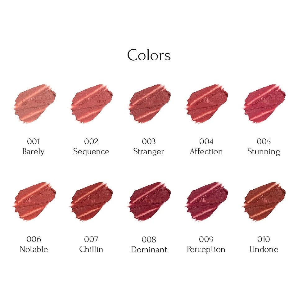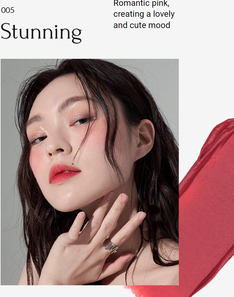 • 004 – Affection hồng đất ánh đỏ: là sự hòa quyện độc đáo với sự bổ sung của sắc đỏ giúp đem lại nét nữ tính nhưng cũng rất thu hút, mạnh mẽ cùng gam màu lạnh này