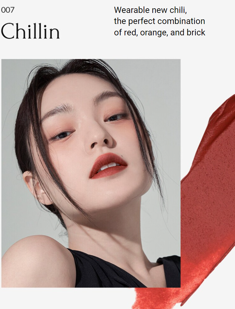 • 007 – Chillin cam đỏ gạch: sự kết hợp của 3 màu đỏ, cam, nâu đem lại sự trẻ trung, nữ tính phù hợp với nhiều tone da và tạo hiệu ứng rất cuốn hút.