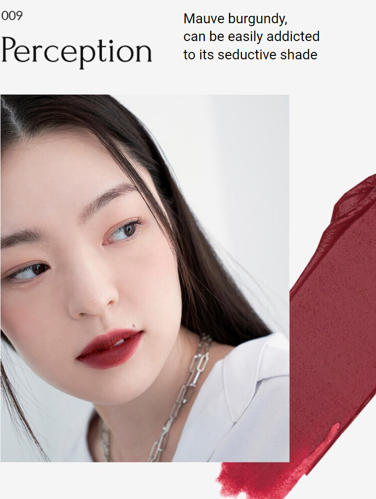 • 009 – Perception với gam màu đỏ rượu: là màu son mà cô gái nào cũng đều thích bởi sẽ giúp gương mặt bạn sáng và nổi bật hơn mà không cần makeup.