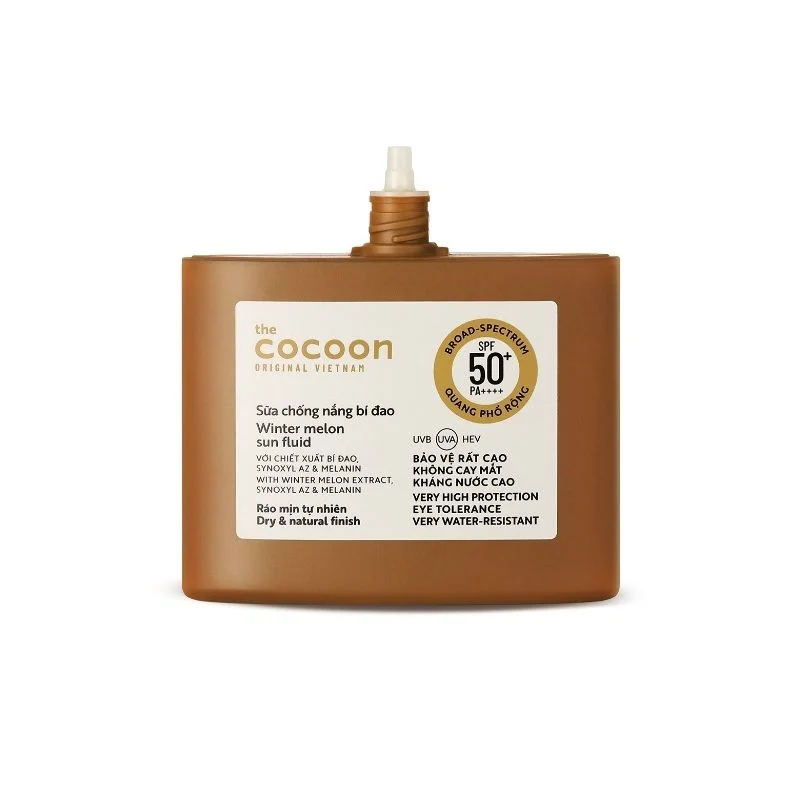 Sữa Chống Nắng Thuần Chay Bí Đao Quang Phổ Rộng Cocoon Winter Melon Sun Fluid Broad-Spectrum SPF 50+ PA++++ là kem chống nắng dạng sữa thuộc thương hiệu mỹ phẩm thuần chay Cocoon đến từ Việt Nam. Nổi bật với sự kết hợp các màng lọc chống nắng thế hệ mới cùng chiết xuất bí đao, Synoxyl AZ và Melanin, sữa chống nắng giúp bảo vệ da trước các tác hại từ tia UV. Đồng thời kết cấu dạng sữa mỏng nhẹ thấm nhanh, ráo mịn tự nhiên, cho lớp nền trong trẻo, khỏe khoắn và cảm giác thoải mái khi sử dụng.