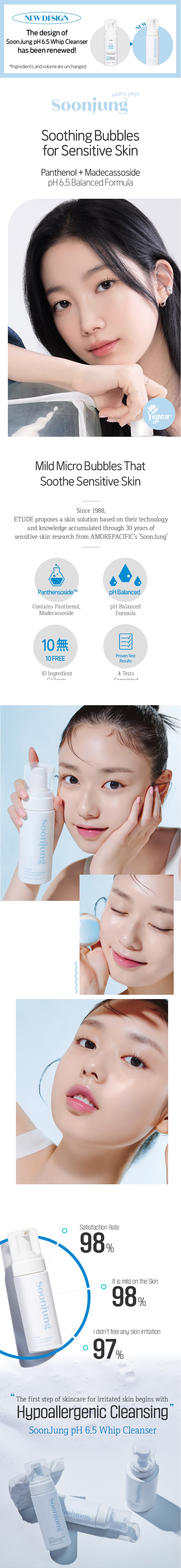 Sữa Rửa Mặt Etude House Soon Jung pH 6.5 Whip Cleanser độ pH chuẩn và có tính axit thấp, ít gây kích ứng