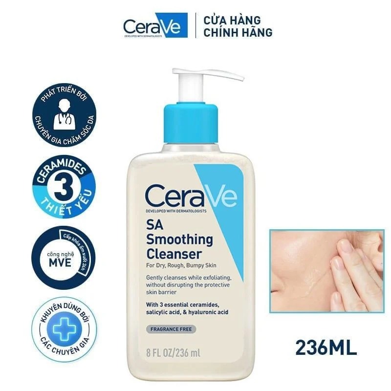 Sữa Rửa Mặt Làm Sạch Sâu Cho Da Mụn, Tẩy Da Chết Dịu Nhẹ Cerave Developed With Dermatologists SA Smoothing Cleanser là sữa rửa mặt thuộc thương hiệu CeraVe được bác sĩ da liễu khuyên dùng. Là sữa rửa mặt an toàn, lành tính cho da làm sạch sâu bụi bẩn, dầu nhờn trên da, đồng thời tẩy tế bào chết, làm giảm mụn ẩn, mụn đầu đen.