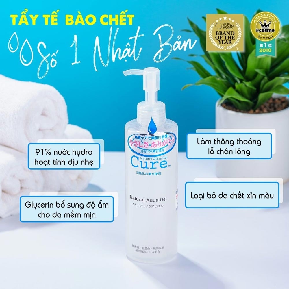 Tẩy Tế Bào Chết Dạng Gel Dịu Nhẹ CURE Natural Aqua Gel 250g là dòng tẩy tế bào chết đến từ thương hiệu CURE của Nhật Bản, với thành phần chứa 91% nước hydro cùng các chiết xuất từ thiên nhiên như lô hội, bạch quả, hương thảo vô cùng an toàn và lành tính trên mọi làn da. Sản phẩm có kết cấu dạng gel giúp lấy đi các tế bào chết, thâm sạm, xỉn màu, loại bỏ các bụi bẩn, dầu thừa đem lại làn da sáng mịn, đều màu.