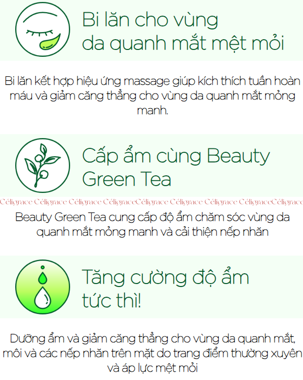 🍀 Massage giảm căng thẳng làn da Bi lăn kết hợp hiệu ứng massage, giúp kích thích tuần hoàn máu và giảm căng thẳng cho vùng da quanh mắt mỏng manh, đồng thời làm dịu toàn bộ khuôn mặt.