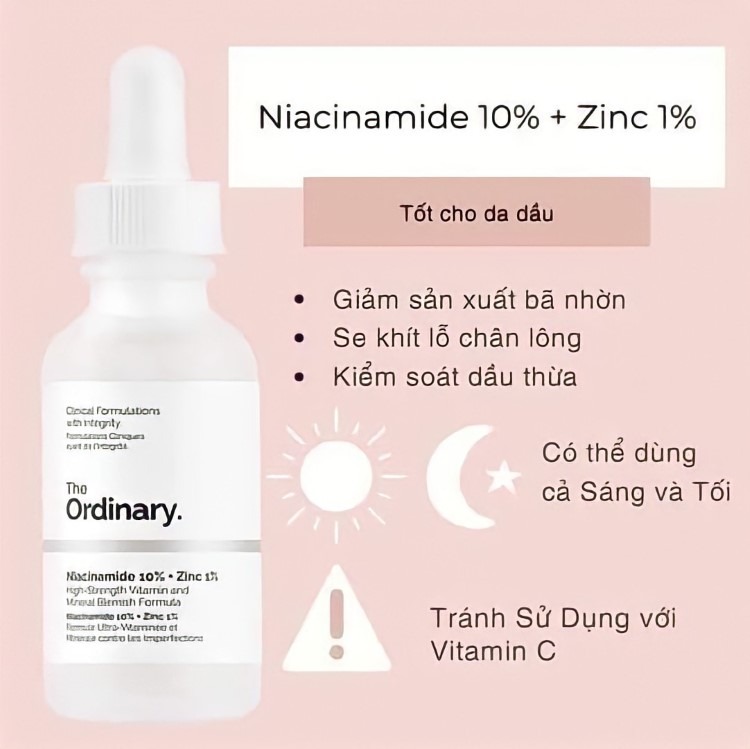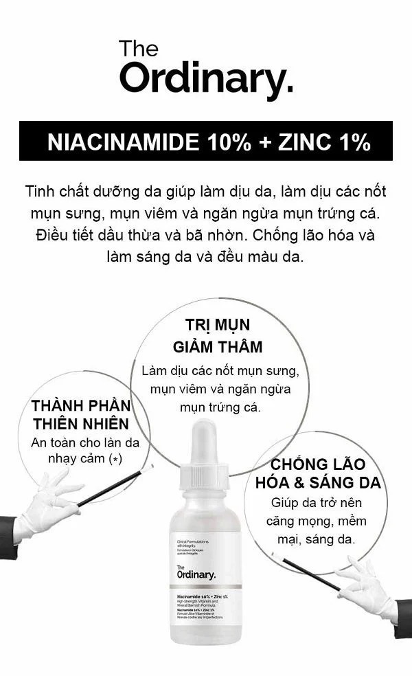 Tinh chất trị mụn, se khít lỗ chân lông The Ordinary Niacinamide 10% + Zinc 1% giúp làm dịu da, làm dịu các nốt mụn sưng, mụn viêm và ngăn ngừa mụn trứng cá, điều tiết dầu thừa và bã nhờn, chống lão hóa, làm sáng và đều màu da.