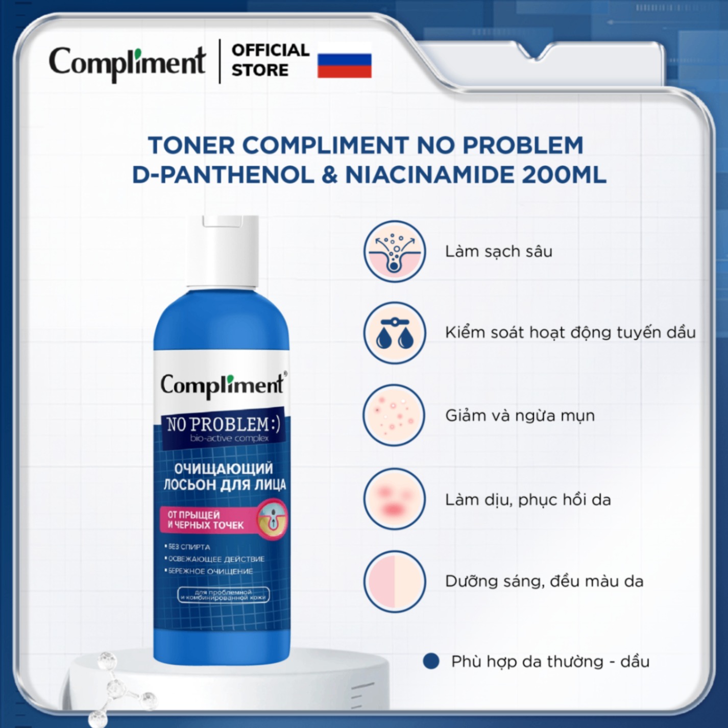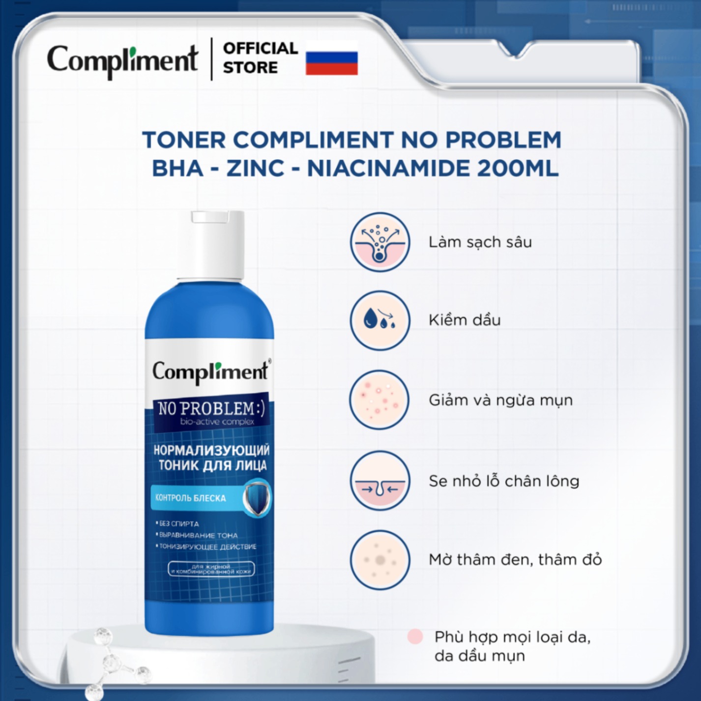 Toner Compliment No Problem Cấp Ẩm, Kiềm Dầu, Mờ Thâm 200ml là sản phẩm toner từ thương hiệu mỹ phẩm Compliment (Nga). Toner giúp sạch sâu, kiểm soát dầu thừa, giảm mụn và ngăn ngừa bít tắc lỗ chân lông nhờ BHA và Zinc PCA. Thành phần Niacinamide hỗ trợ làm mờ thâm, se khít lỗ chân lông và cải thiện sắc tố da, mang lại làn da sáng mịn và khỏe mạnh. Kết cấu lỏng nhẹ không gây khô căng, phù hợp để sử dụng hàng ngày cho làn da sạch thoáng và tươi tắn.