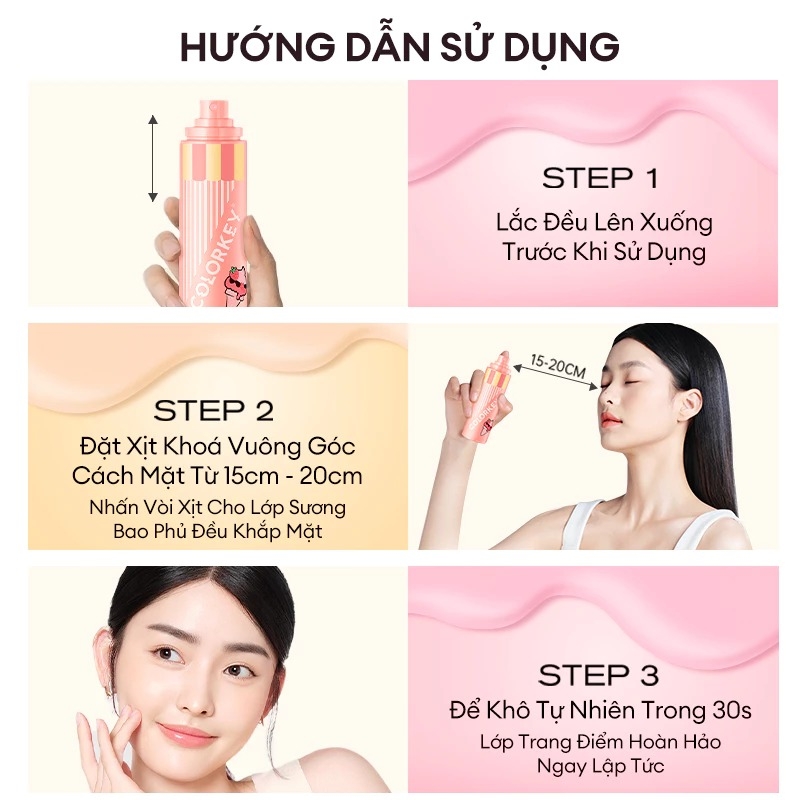 - Để khóa lớp trang điểm lâu dài và giúp da luôn mềm mại, xịt lại trong suốt ngày nếu cần thiết.