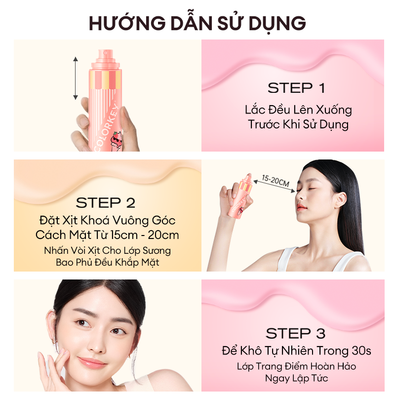 - Giữ khoảng cách 20-30 cm và xịt nhẹ nhàng lên toàn bộ khuôn mặt sau khi hoàn thành lớp trang điểm.